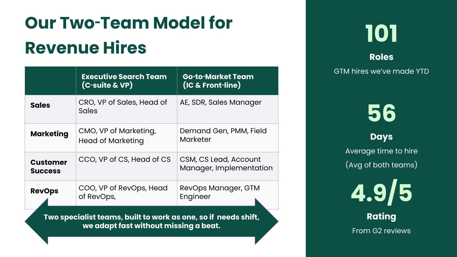 We’re more than recruiters, we’re strategic partners. With deep connections built through active engagement in the SaaS community, we identify exceptional candidates who align with your goals and culture. Our expertise extends beyond recruiting, offering guidance on hiring strategies, compensation benchmarks, and best practices to position you for long-term success.
