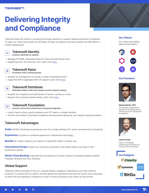 - Tokensoft Awareness: crypto-native marketing support (socials content audits, design, PR, media, & educational content) and an audience of 3+ million.